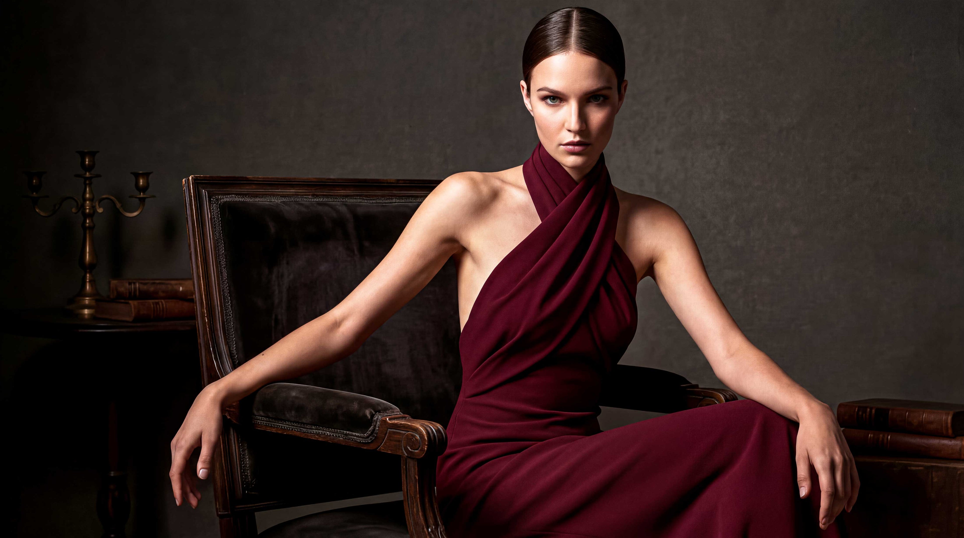ELVYRA is a study in vertical precision and sculpted fluidity. A high collar frames the neckline while the open back reveals controlled sensuality. The bodice is constructed through directional pleating that converges toward the waist, creating a sharp yet fluid silhouette. A sculpted draped structure defines the waist before releasing into a full-length pleated skirt that moves with architectural grace.